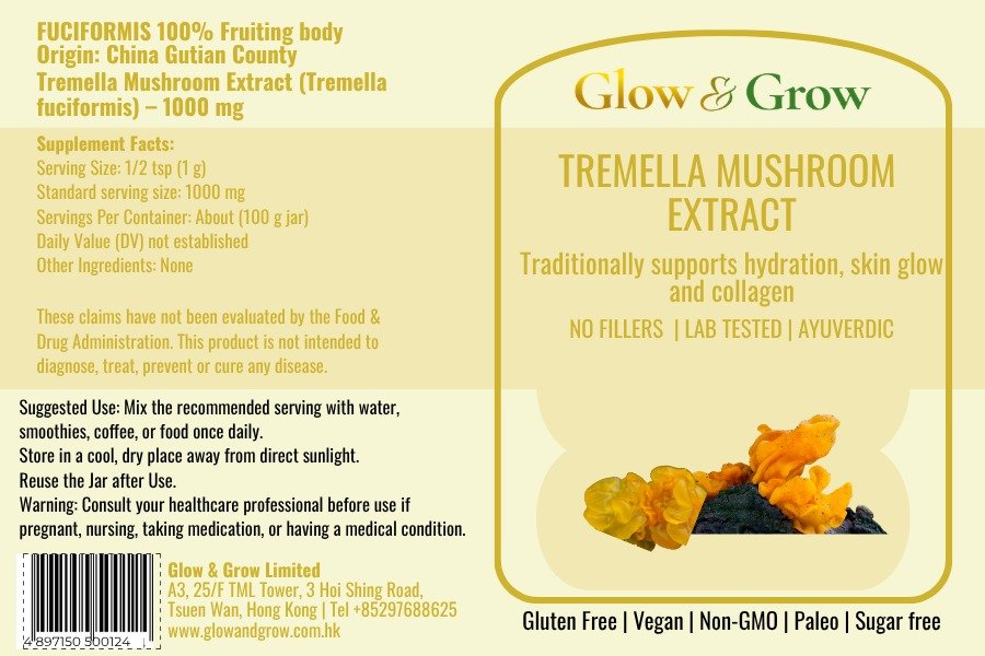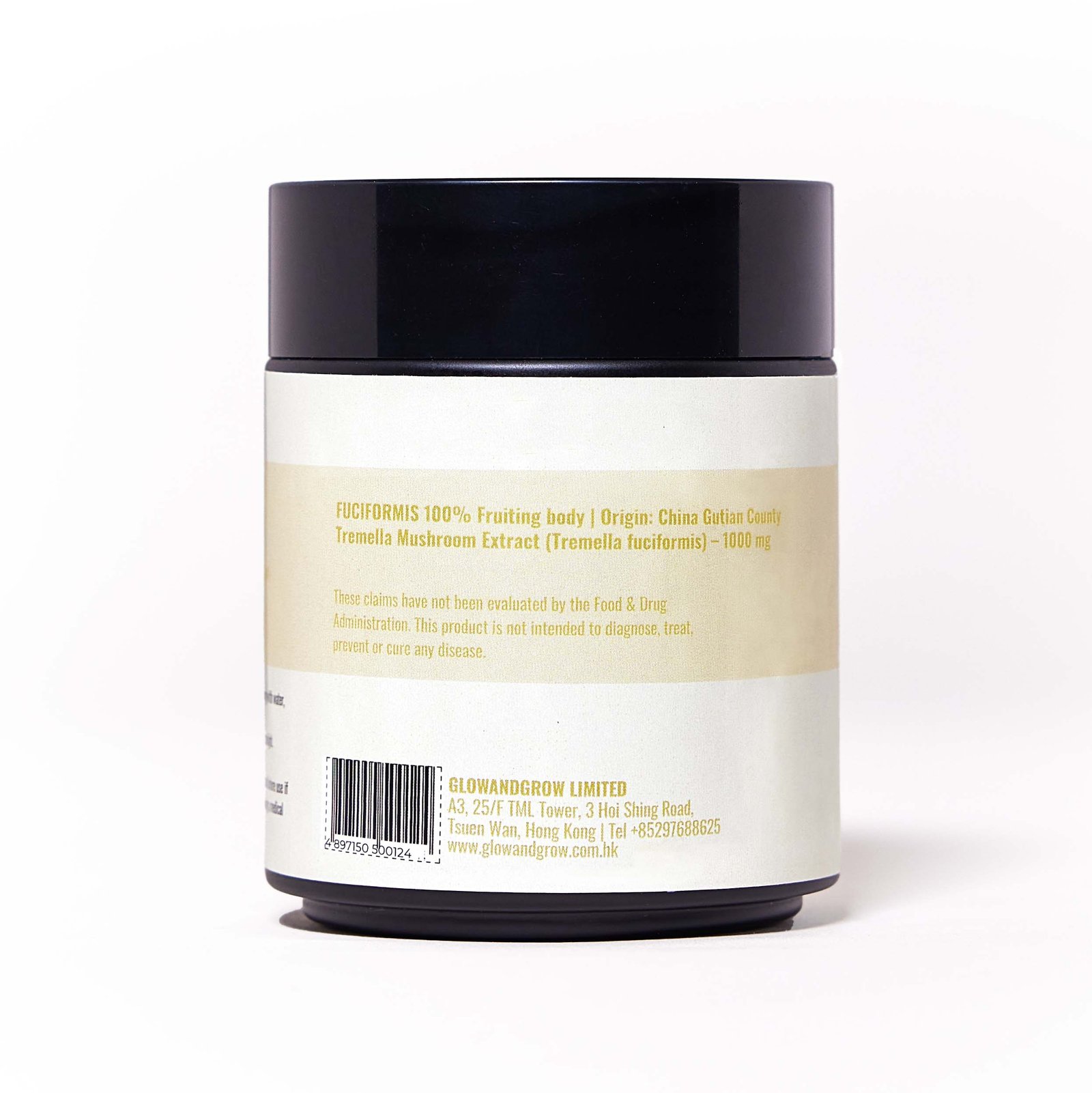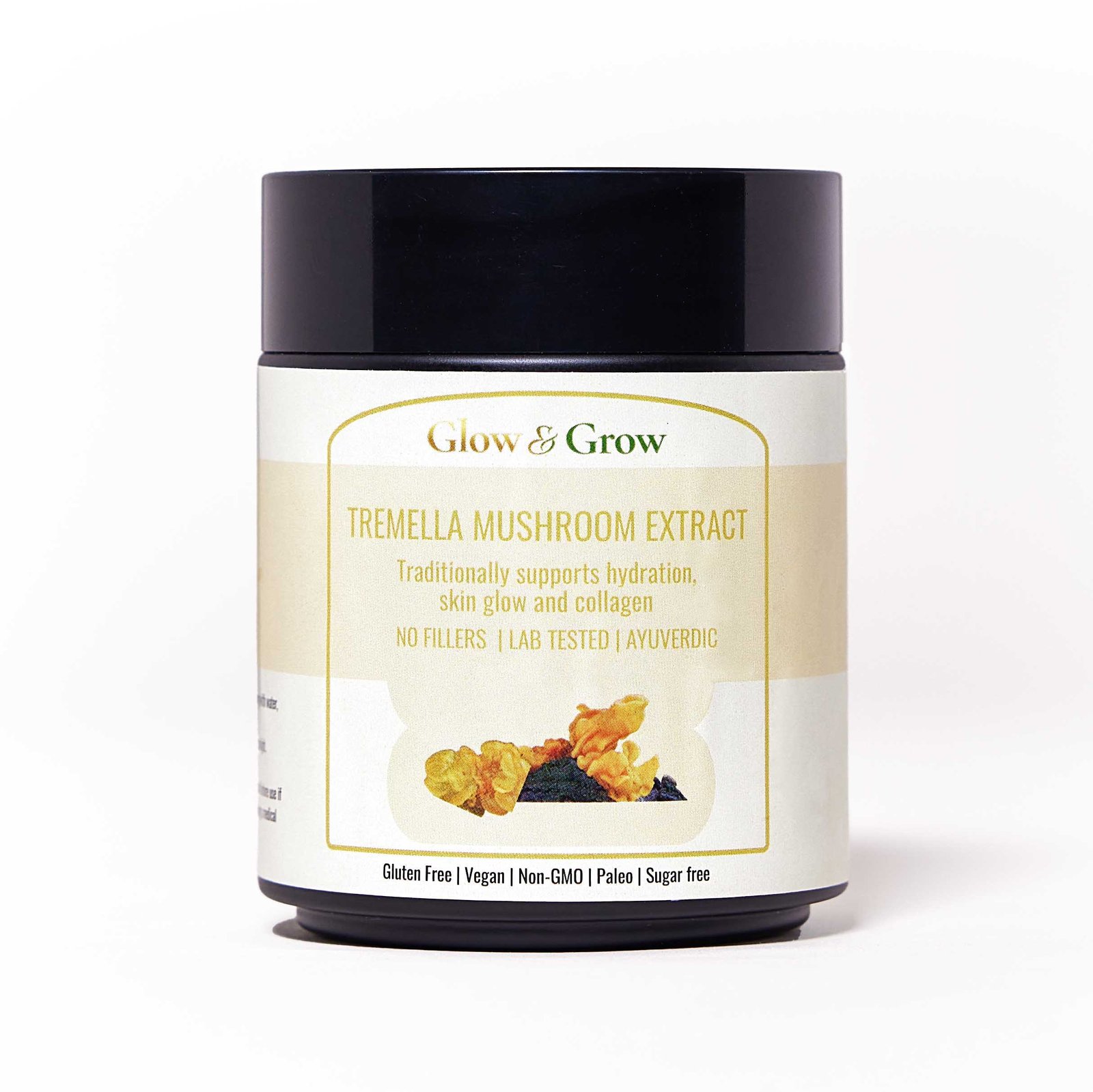 GlowandGrow Tremella powder is derived from Tremella fuciformis and standardised to contain 30% polysaccharides to ensure reliable strength in every serving. This fine, scoop-able powder blends into hot or cold liquids and can also be used in at-home skincare preparations for added moisture-supporting benefits. With a single-ingredient profile and no added fillers, it’s an easy way to incorporate a traditional functional mushroom into contemporary wellness and beauty rituals.